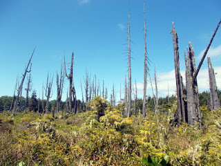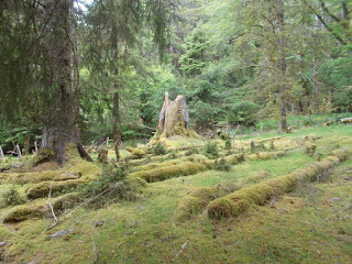 The swamp was created when the company that owned the fish cannery down in the bay below dammed the freshwater supply to service the factory. It backed up the springs at the top of the island, creating a huge boggy area and killing the big cedars that grew there. The cannery has gone long ago, but the community decided to keep the ecological disaster and turn it into a park. The result is a place of great beauty. The dead trunks are hundreds of feet high.