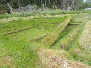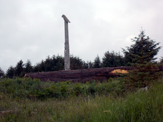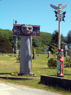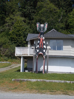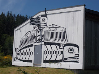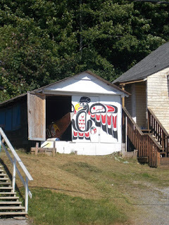 Tomorrow I'm going out to explore the forests and the beaches, hoping that the weather, which has become overcast and rather gloomy, will improve a little. But I really shouldn't be wishing for the sun - they're desperate for rain here, having had dry sunny weather and high temperatures for almost a month - unheard of! No one here questions climate change and the Haida, like other First Nation people in Canada are at the forefront of environmental action. There are NoEnbridge signs in front gardens signalling opposition to the trans Canada pipeline that is supposed to transport oil from the Alberta tar sands to a tanker port on the coast too near Haida Gwaii for safety. In the Masset coffee shop there's a poster warning of the Fukishima radiation turning up on the beaches here - as a Haida saying has it 'Everything is connected' - what we do in one part of the world affects everyone else.