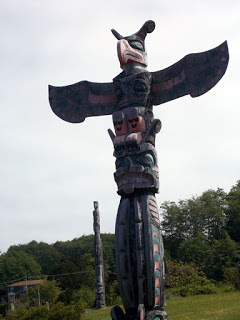 Well, apart from sleeping in Margaret Atwood's bed and having my breakfast cooked for me, what I've really come to see here are the remnants of Haida culture at the northern end of the northernmost island. The Haida seem to have been one of the most successful First Nation people in preserving their traditions, though it was touch and go - not long ago there were only 5 native Haida speakers left alive. But Haida artists in particular have kept the artistic traditions going and are handing the skills down to younger generations. One of them is