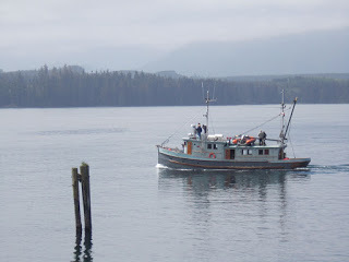 A fishing boat leaving harbour earlyIt has the feeling of a place on the edge of something. There's very little money here now - the days of the 'million dollar catch' are gone and the fishing is thin, but it's either that or logging and most people divide their time between the two.