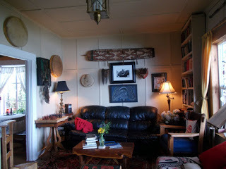 and is one of the most interesting and quirky guest houses I've ever stayed in. It's like staying in the curiosity shop of some exotic bazaar. My bedroom has the most beautiful peacock silk embroidered curtains balanced on a bamboo pole (heaven forbid I should ever have to close them!), there's a bedside light made out of a bamboo teapot, a ceiling light made from a wheel, puppets dangling from antlers, a copper bowl full of stones, bones and feathers, and the walls are decorated with paintings and hangings by Haida artists. Raven is here in all his incarnations. All the rooms of the house are crowded with wonderful things. This is the sitting room, complete with African penis gourd and The Last Supper arranged in a sardine can.