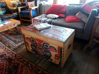 Copper Beech has a long history - it was originally owned by an island eccentric and was at one point a 1$ flop-house. Then the previous owner ran it as a B&B which was famous for impromptu dinners and excellent company as well as the outrageous decor. David Philips, something of a performance artist, played host to 'lost souls, hippies and celebrities like the Trudeaus'. Apparently if you stayed here you never knew quite what might happen, and you were just as likely to fall through the furniture as into it. Susan has changed the beds and the sofas in the interests of comfort, but the rest has been kept just as it was. This is the Haida carved chest in the sitting room, used as a coffee table.