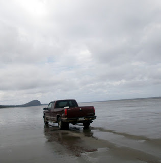 Randy, driving down North Beach to beat the tide.I bounced around with the razor clams in the back.