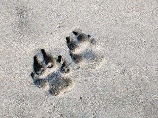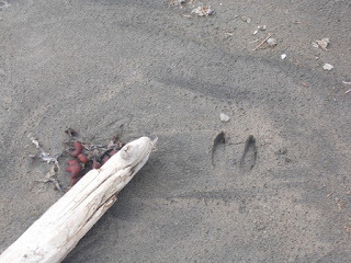 I've been staying in a Bear Hunting Lodge - except that it's under new management who are rather more bear friendly. So it's not surprising that I bumped into a bear on an evening walk. I took my picnic supper about an hour's walk up the coast, to the mouth of the Tlell river, and ate it sitting on a piece of driftwood in the dunes facing the sea. As I turned around the spit to walk back along the river, I saw something move up the river bank into the trees which grow right down to the edge and thought it was a deer - there are a lot of them here and they're quite tame. Then I saw the tracks, coming from the dunes to the river, and realised that it was a bear. He had probably been sitting in the dunes munching the wild strawberries that grow there while I was eating my supper! My only regret is that I didn't get a good look at him - still can't say that I've seen a bear.