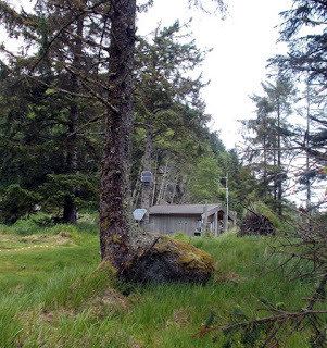 The Watch Hut with its radio mastOne of the Haida men who had come on the boat was the son of a hereditary chief of the clan and he told us his childhood memories and how his father had often brought him back there on camping trips, showing him the old places and telling him the stories of his clan. He was able to tell us what each of the House Poles meant and who had lived in the various houses, now collapsed.