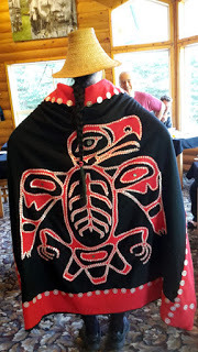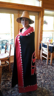The location of the lodge (called Haida House) is a small hamlet called Tlell - halfway down the east coast of Graham Island, where the Tlell river goes into the sea. Tlell is quite remote - midway between Masset and Skidegate on the Yellowhead Highway (the only highway). It's a beautiful place, and the staff are mainly Haida. Allison, who serves us breakfast, brought her Haida ceremonial regalia in to show us.This consists of a woven spruce root hat and a button blanket. These have evolved from animal skin robes and are now traditionally black and red, decorated with buttons of mother of pearl or abalone.