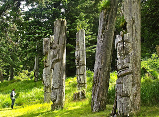 Some of the old Mortuary poles I'm hoping to seeFor the past 3 years I've been working on a new poetry collection, centred round the mythology, and the history, of the Haida people who lived on islands off the Pacific coast of Canada and Alaska for more than 8,000 years (until we arrived). Within a couple of decades of our arrival as colonists their population was reduced from more than twenty thousand to less than five hundred. They have a unique culture - both art and poetry - which I'm hoping to experience at first hand rather than just through books. Like most hunter gatherer societies they had a holistic approach to the environment they lived in and depended upon. They had a saying 'Everything is connected to Everything'. That has a very strong message for us today.