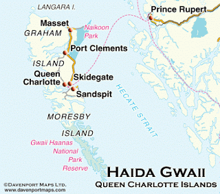 Then I'm back on schedule with a flight to Masset at the northern end of Haida Gwaii, 'on the edge of the world'. The islands are much, much further north than Vancouver Island, which is off the south coast of British Columbia, and I'm going to the northernmost part, more than a thousand miles from Vancouver - almost in Alaska.