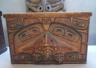 Haida painted chests were also there, with their mysterious 'formlines' which take their ancestral storylines into abstraction. These chests were an important part of Haida life, containing their ceremonial regalia and storing the gifts that would be given away by the chief at the 'Potlatch' feasts. When a chief died, he would sometimes be interred in one of these chests, folded into a foetal position.