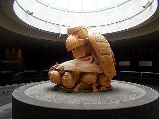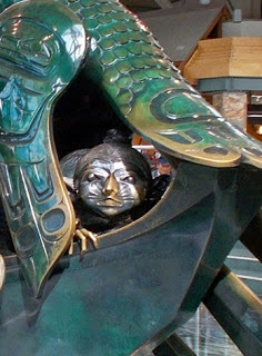 It's one and a half times life-size, cast in bronze with a jade patina and is also called the Jade Canoe. It's difficult to photograph because of the way the light reflects off the bronze. All the main characters of Haida mythology are depicted - Raven steering at the back, the Bear at the front with his human wife and their cubs, Frog, Dogfish Woman, Wolf, Beaver, the Ancient Reluctant Conscript (human) with his high hat, and the tiny Mousewoman peeping from under Raven's wing.