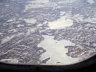 Arctic Tundra from 38,000 feetAfter more than 9 hours of being cooped up in a small space like a battery chicken it was good to be out in daylight again. Compared with other big national airlines, British Airways is definitely no frills - a kind of upmarket Ryan Air. The inflight entertainment system wasn't working properly and the catering was minimal. But I cheered up in the sunny weather and the sight of Haida artist Bill Reid's 'Spirit of Haida Gwaii' sculpture in the centre of Vancouver Airport Arrivals.