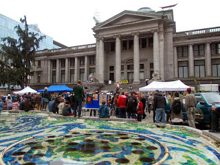 I consoled myself with breakfast in a Chocolate Cafe - about 2000 calories of waffles, cream and Belgian chocolate (best skip over that one!) - and made my way through the steel and glass canyons to find the Vancouver Art Gallery, where I stumbled into a massive demonstration against GM Foods and Monsanto Spraying. Apparently it's a big problem in Canada.