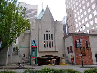 But what made me very, very, angry, was the fact that the Art Gallery has no work by any Canadian artists, historic or contemporary, who are of indigenous origin. The exhibits are all European art, or Canadian artists working in the European tradition. It's a kind of Art Apartheid. It's OK to have Emily Carr, a European who painted indigenous works of art, but .... You want to see indigenous art? You have to go to the Museum of Anthropology. Or down the road, where a gallery in memory of one of the greatest artists that Canada has ever produced, Bill Reid, is showing work by him and by other indigenous artists. The Bill Reid gallery is a small art-deco gem among the tall buildings and manages to survive the flashing neon sign outside advertising the underground carpark that serves the shopping mall next door.
