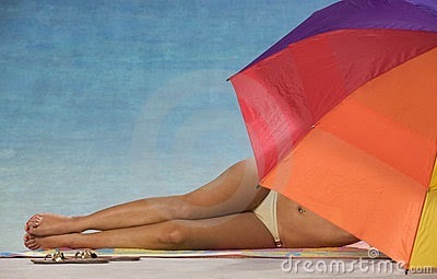See that bikini clad woman lying on the beach towel, eyes closed behind the shades? She's eavesdropping a conversation between two people having an argument under a nearby umbrella. Notice the notebook strategically placed next to the iced drink and the sun tan lotion.