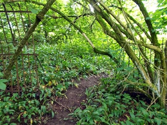 Today, walking in the woods to see the rhododendrons, which are in full bloom now, I noticed that a section of the perimeter wrought iron fence was missing and there was a boot-track through the wild garlic. Who could resist such a temptation?