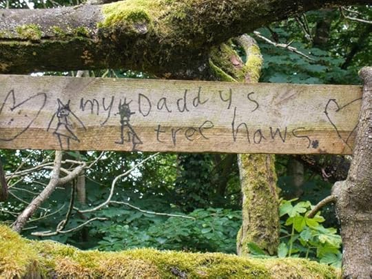 The track soon expired, but I beat my way through the nettles between the yew trees, all curiousity and courage. There was a fallen tree and on it a rather poignant wooden plank - 'My Daddy's Tree Hows'.