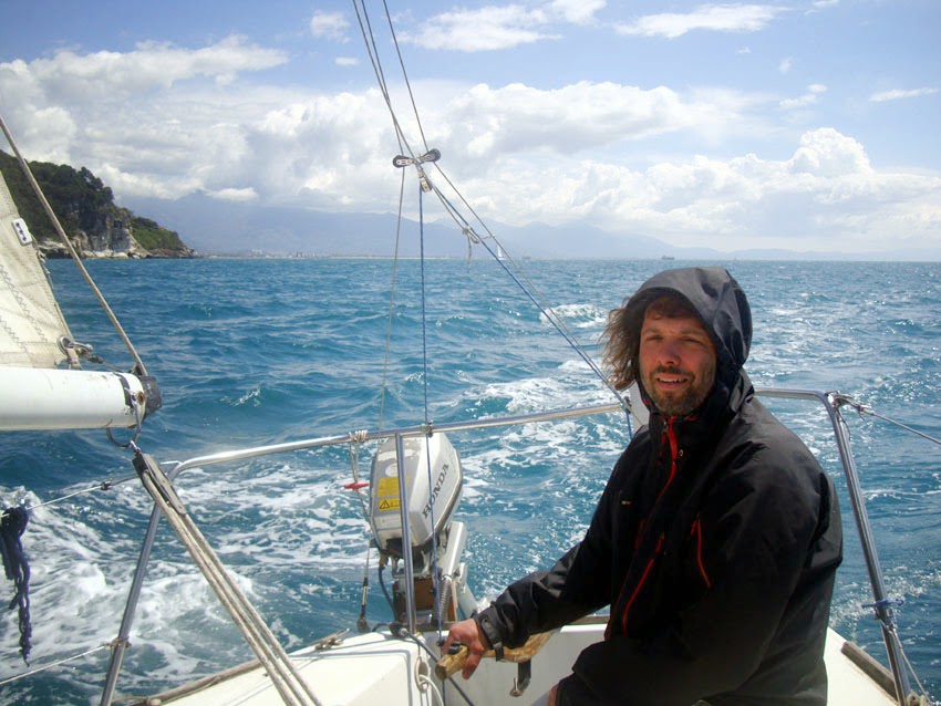 The crew - none of them oligarchs . . .So the unopened suitcase got left on the bedroom floor and the bed was still unmade and the breakfast dishes unwashed. Neil swallowed the sea-sickness pills as we headed out for the boat mooring and we were soon tacking out of the La Bocca di Magra into the Mediterranean and a bit of a shock! Although it was a clear, calm day, once out of the river there was a very lively wind and a choppy sea that had us heeled over at a steep angle gazing down at the water and an almost horizontal sail. No photos - it's difficult to hold a camera when you're clinging to the wire with your feet wedged on the cabin.