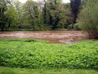 Not surprising with all the rain that they've had in the north. And the river was rolling merrily along, full and brown and lively and very un-summery. From the amount of mud on the cobbles and the grass, it has recently been flooded up to the front doorstep.