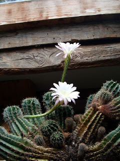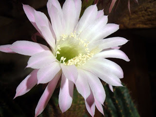 While I've been at home, I've been watching the progress of my midnight cactus. It had bloomed six times while I was away, which grieved me a lot, since it flowers only occasionally and is really spectacular when it does. I sadly threw away the withered stalks. Then, I noticed that two other buds were forming, but I was pessimistic about the chances of my still being there when they opened. But, at 11.30pm on my last night, they magically bloomed. This is what they looked like the following morning:
