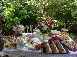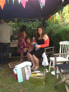 This is a traditional English afternoon tea, served in a borrowed gazebo in someone's backgarden, for a 'baby shower' party. And this is the lucky girl opening her presents!