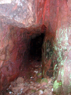 It's been bricked up at some point, but you can get through the breach. The walls inside are still stained red with the iron ore.