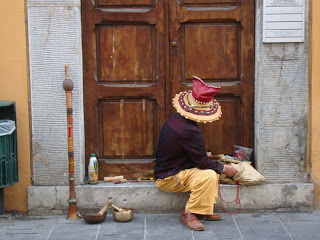 And finally, the Piazza wouldn't be the same without the characters who live on the street. This is the Tibetan, dressed in full Tibetan costume and playing strange instruments. He used to have a dog and a rabbit in a cage, but the animal welfare took them away. He's probably not Tibetan at all, - his story varies depending on the listener. Sometimes it was his wife who came from Tibet, sometimes he just visited, sometimes he came from Tibet. Whatever it is, his soul is obviously in the high mountains of the Himalayas.