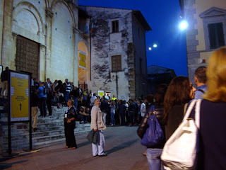 It was Orhan Pamuk’s night at the Pietrasanta LitFest, newly arrived from Istanbul, where he’s been actively supporting the protesters in Taksim Square. He was originally booked to appear in St Agostino - a large church which is now an arts venue - but so many people came to hear him the queues were round the block. It was obvious only a fraction of us were going to fit in. So at the last moment, they swapped the venue and we all made a mad dash for the seats in the Piazza. Italian queuing on a small scale resembles a rugby scrum and on a large scale - it’s a riot! Almost trampled to death in the crush. After all the messing about, the event finally got under way at 10.30pm.