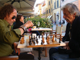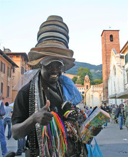 No event in the Piazza is ever complete without Mortela - the Senegalese street seller! There are lots of them, but he's the most colourful. Their stories are fascinating. How they stay alive I don't know. Apparently no-one's buying much at the moment. The tourists haven't started to arrive yet and Pietrasanta residents are already stocked up on hats, friendship bracelets and tissues.