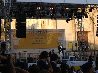 His talk didn't cover a great deal of ground - it was being translated, paragraph by paragraph, which made for slow progress - we sloped off for a pizza towards the end and came back to listen to an Italian cartoonist and satirist, Vauro Senesi, concerned about the level of unemployment, particularly among young people in Italy. By 10.30 it was too dark to take photographs. Felt very frustrated that my Italian still isn't good enough to follow this kind of complex argument. Probably much more relevant and interesting than Dan Brown!