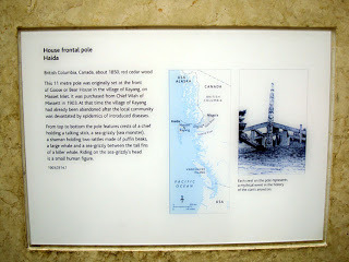 For some time now I've been working on a series of poems based on the mythology of the first nation people of the Haida Gwaii islands off the north Pacific coast of Canada and Alaska. Their art work has always fascinated me, particularly the house poles they erected in front of their houses, intricately carved from giant redwood trees. These poles tell the family stories of the clan who live there and often feature either the raven or the eagle. So imagine my delight and surprise when I walked into the British Museum to see the Ice Age Art exhibition and there in the courtyard was a Haida house pole! It comes from the village of Masset on Kayang inlet - which no longer exists as a Haida habitation. The chief's house was called either Goose House or Bear house and the pole that tells his lineage has been beautifully preserved. You can see the mythic figure of the Shaman with his Puffin Beak rattles near the top, and lower down there's a small man crouched on the head of the sea monster between the tail flukes of the whale. Sitting at the top is the chief whose pole it is. Not a raven in sight though - Chief Wiah obviously had connections with the sea, since there are two sea monsters, a whale and an orca beneath him. I'd love to know the stories they represent.