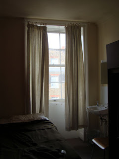 This is what London on £50 a day (or night) looks like - the top floor of an international students' hostel near Russell Square. The room is basic - a single bed, a sink, a battered wardrobe, and carpet you'd prefer not to put your bare feet on. The curtain rail sags in the middle, there's no plug for the sink, you have to share a bathroom with 5 other people, and the radiator won't turn off. It's the kind of room that might drive you to suicide, which is perhaps why the windows only open about 3" max! But the sheets are clean, it's cheap and I couldn't afford three days in London any other way. If you buy sandwiches and fruit in Tescos Express round the corner and eat them in the square - you can live cheaply in what is one of the world's most expensive cities. Happy days!!