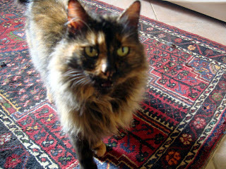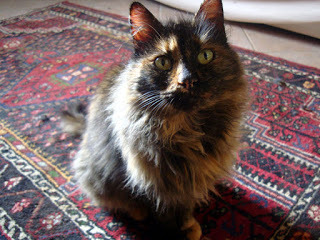 When we came back from England after Christmas, we noticed a cat huddled under the rubbish bins in the recycling area where we park the car. A new cat - a long-haired dark tortoiseshell. It came towards us in a friendly fashion, so not a wild-cat. But, we thought, probably belonging to a neighbour.
