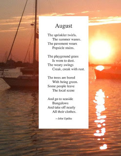 John Updike being facetiousI'm not doing much blogging or Facebooking this month - it's time for reading, relaxing (alcohol is involved here) and enjoying the smallest members of my family who come to stay. The Girl is working at a local hotel, making beds and cleaning up after tourists. Neil is in Italy (hotter than a pizza oven) house-sitting for a friend and trying to get some sculpture done. I'm copy-editing a book for the autumn, in fits and starts (mostly stops), and working on some new poems. I found the above poem by John Updike online and it immediately reminded me of Fleur Adcock's poem 'Future Work', where the poet is optimistically thinking about the summer ahead.