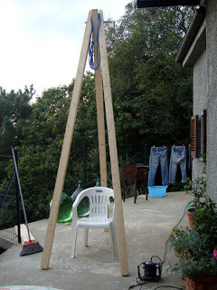 No, Neil hasn't decided to end it all - this is his home-made hoist to lift half a ton of marble! He's been searching for the right marble to make a new sculpture, or more accurately, a group of three small sculptures that have to be carved out of the same marble. Finding the right piece has been difficult, because most marble has veins of a darker colour, and these angular shapes needed something plain.