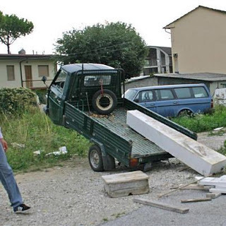 Marble studios have been closing down all over Pietrasanta during the last year - the economic crisis is causing a big cut back on marble fireplaces, shelves, floors and other big items for houses, as well as sculptures. In one of the closed studios we found what we wanted - a lovely piece of white Greek marble, glittering in the sun in the long grass and the brambles. The owner was glad to sell it and gave us a good price. Marble is heavy, and the studio no longer had any cranes or fork lifts, so Neil improvised with a hoist. A friend offered to transport it in his Ape - and this is what Neil posted to Facebook!