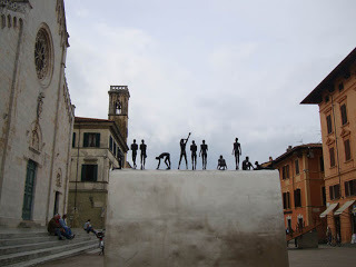 Because of its connections with art and sculpture particularly, Pietrasanta has been given the title of 'La Piccola Athene' - Little Athens. But the sculptors working around Pietrasanta are getting fewer and fewer due to the crisis - they are a very small band now, but some beautiful work being done. This is from the current exhibition in the Piazza - Bergomi's bronze figures. Some people love them - but they're a little bit 'static' for me - they don't offer much for the imagination, except perhaps when photographed against the skyline.
