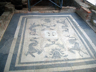 Massaciuccoli, we discovered, also has some amazing Roman ruins. They are on permanent display, under shelters with wire fencing so that you can see, but not touch! This is a rich man's mosaic floor.