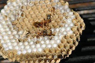 Cells that looked empty proved to have a tiny egg at the bottom - others had grubs in various stages of growth. Many of the cells were sealed over with paper and these contained the pupae - magically changing from maggot to hornet. Some of them were already beginning to chew through the paper lid and crawl out into the light.
