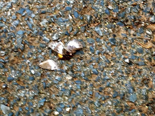 Hornets - at least in Italy - are aggressive and carnivorous. Quite by chance, when out walking with some of the writing group, we came upon a hornet attacking a butterfly. It chewed off the wings and then carried the struggling remnants up into the branches of a tree. One of the group managed to photograph it on the ground with her I-phone. Thanks Jillian! You can just see the yellow body of the hornet against the wings - one already detached.