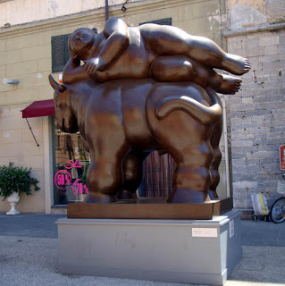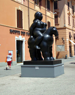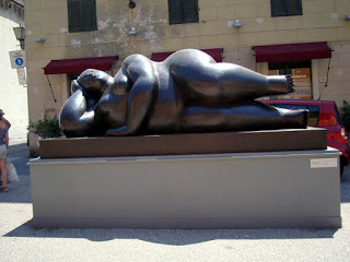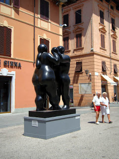 Pietrasanta's current exhibition in the Piazza is South American sculptor Fernando Botero's bronze sculptures of women and animals. Botero is famous for his depictions of obese (the correct art term is 'volumetric') forms - he's not much noticed in the UK but elsewhere in the world he's BIG! He has a house in Pietrasanta and works here quite a lot, alongside his Greek wife, artist Sophia Vari. You either like his work, or you don't. I prefer his drawings and paintings to the sculpture - they remind me of Diego Rivera.