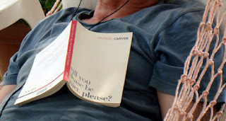 It's hot here, with a lovely breeze that springs up in the afternoon, perfect for a siesta on the terrace. Neil brought a hammock back from Cambodia and the plum tree and the olive tree are just the right distance apart to rope it up to. And, of course, you've got to have the right reading material. When I tiptoed out and discovered he had fallen asleep reading Raymond Carver's Will You Please be Quiet, Please? I just couldn't resist the pic!