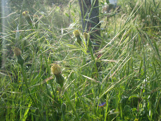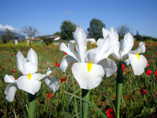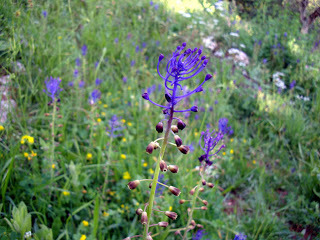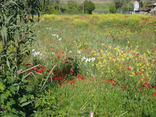 Early summer is in full bloom here, flourishing in the warm temperatures and the rain showers. In another month 'il gran caldo' will be upon us and everything will be burnt brown in the drought. But for now the olive groves are knee high in wild flowers and herbs. They don't use herbicides here and it shows. There are probably at least a hundred species, if I knew how to name them - orchids and bluebells, ornamental grasses, chervil and clover, wild garlic, daisies and dandelions, small red poppies (corn cockles?) and dozens of plants I'd have to buy at the garden centre in England - pink and white oxalis, canterbury bells, hellebore and irises.