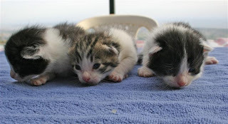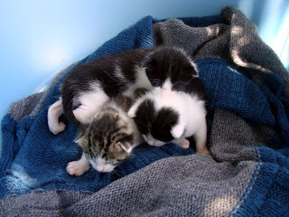 This is our attempt to put them on a flat surface for photographic purposes. There are two big bat-cat look-alikes, one definitely male (on the left) the other possibly. The tiny tabby in the middle is a female and she's much smaller than the others. Our attempts at photography ended in failure - they always end up in a heap!