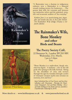 Wednesday, it's down to London on the Virgin express (snow permitting!) and the Poetry Society Cafe for a reading with the wonderful Janet Sutherland. We're both reading from our current collections - I'm launching the Rainmaker's Wife and Janet is previewing her work in progress as well as reading from Bone Monkey. There is wine and food in the cafe and good poetry in the basement! Do come if you're in London - the event is free and there's an open mic slot.