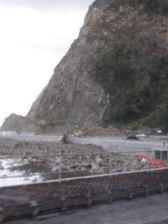 One of the landslide sites under construction near KaikouraNow the road has been bulldozed out from underneath millions of tons (I'm not exaggerating) of rock and earth and is being reconstructed. Whole sections - totalling about 100 km - are being built from scratch. It's a mammoth undertaking. The mountainsides are being stabilised, but big containers are stacked up to protect road users from falling rock until it's finished.