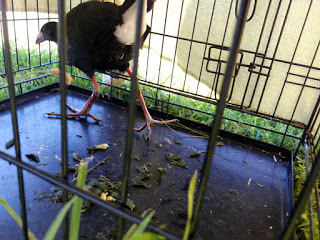 Meet Pukeko, one of New Zealand's native birds. They are marsh chickens - quite large with very long legs. They run well, fly well and apparently have very adventurous appetites.