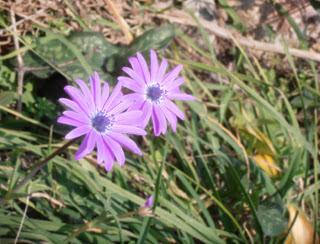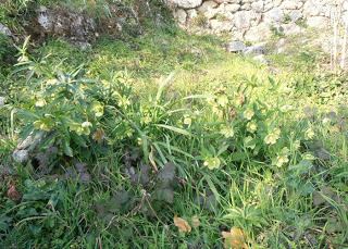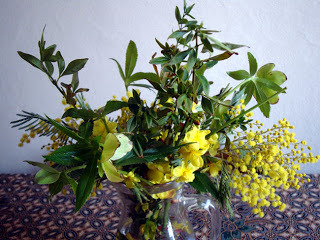 The mimosa is flowering and the grass is starred with purple/pink anemones and tiny narcissi. The creamy green hellebore we call 'Easter Roses' are everywhere. The sun has warmth in it - enough to sit out and drink a glass of wine wearing only a jumper. It certainly lifts the spirits.