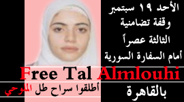 "al Dosr al-Mallohi (al-Mallouhi) (Arabic: طل الملوحي ) born in Homs January 4, 1991. She is considered the World's youngest prisoner of conscience. On 27 December 2009, Tal was taken from her home by officers of one of the security offices in Syria because she has written poems about Palestine and social commentaries on her blog. Since then, her parents don't know which security office has detained her nor where they can visit their daughter. Tal al-Mallouhi has been accused by the Syrian government of being a spy for the United States of America, and sentenced on February 15, 2011 to five years in prison."