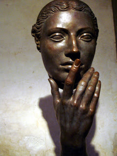 Dutch sculptor Margot Homan exhibited this bronze figure of a women holding her finger to her mouth - Il Silenzio. It's very finely balanced.