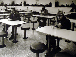 One of the most interesting things about the exhibition is Romano's commentary on what is, effectively, a record of his life. Under a stunning black and white photo of a room full of men all sitting at separate tables in a bar, he writes that 'men's loneliness is linked with fear. Men fear one another.' And fear leads to war.